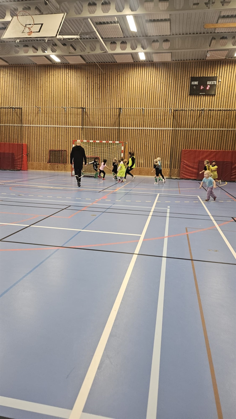 ”Boll-stopp” till musik. Först med fötter, sedan hela kroppen utan fötterna, sedan körde vi tunnelkull med boll där tränare gick och kullade.